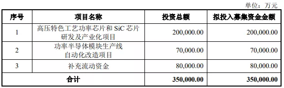 其中,高压特色工艺功率芯片和SiC芯片研发及产业化项目总投资金额20亿元。拟通过新建厂房及仓库等配套设施,购置光刻机、显影机、刻蚀机、PECVD、退火炉、电子显微镜等设备,实现高压特色工艺功率芯片和SiC芯片研发及产业化。项目达产后,预计将形成年产36万片功率半导体芯片的生产能力。