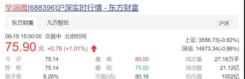 6月15日,华润微股票涨幅1.01%,报收75.90元/股,总市值达1002亿元,成功突破千亿市值大关,尽管在今日(16日)的市值有所下滑,但依然逼近1000亿元。